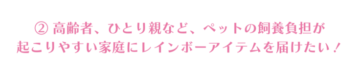 ペット(特に保護動物を引き受けられた)と暮らす高齢者、ひとり親など、ペットと暮らす良さはあるのに、反面、飼養負担が起こりやすい家庭にレインボーアイテムを届けて終生飼養を伴走支援します。