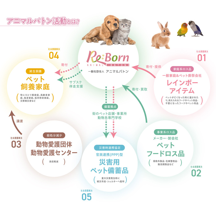 遺されたペットの遺品(ペットシートやフード)を無駄にせず次に繋げることで、未来のペットや里親さん達の思い出とともに愛犬・愛猫が生き続ける。また行政と連携することで被災地支援にも繋がる。それが『RE:BORNアニマルバトンプロジェクト』です。