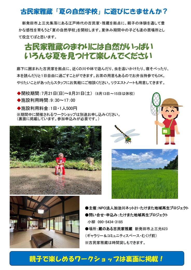 7月21日(日)から8月31日(土)まで夏休み期間中に開校する「夏の自然学校」のフライヤーが出来ました。古民家の活用×地域資源の活用×体験学習×交流をコンセプトに、たけまた再生プロジェクトと環境学習に取り組んでいるNPO法人加治川ネット21,元教員とタッグを組んで開校します。