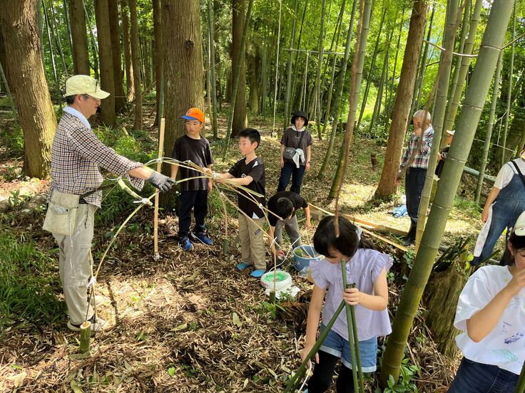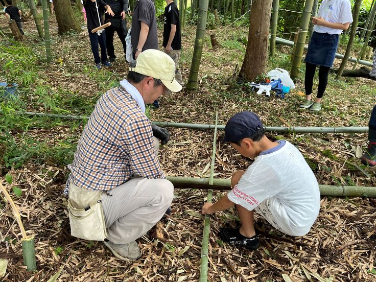 子ども達がノコギリとナタを片手に竹を切りハウスやベンチを作りました。