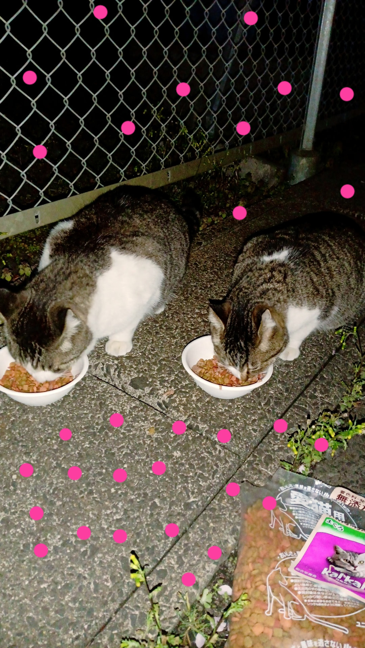 最近ずっと2匹で揃って出て来てくれます😀本当に可愛い子達です。もう、2匹も6歳位になると思います。私は自分の責任をしっかりと感じています。世話している子達が怪我をしたり、病気になったりしたら、触れない子でも、諦めずに何かの方法でにの治療をして行きたいと思っています。自分も病気持ちなので、歩けなくなったりして、とても憂鬱なのですが😥