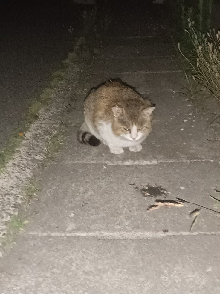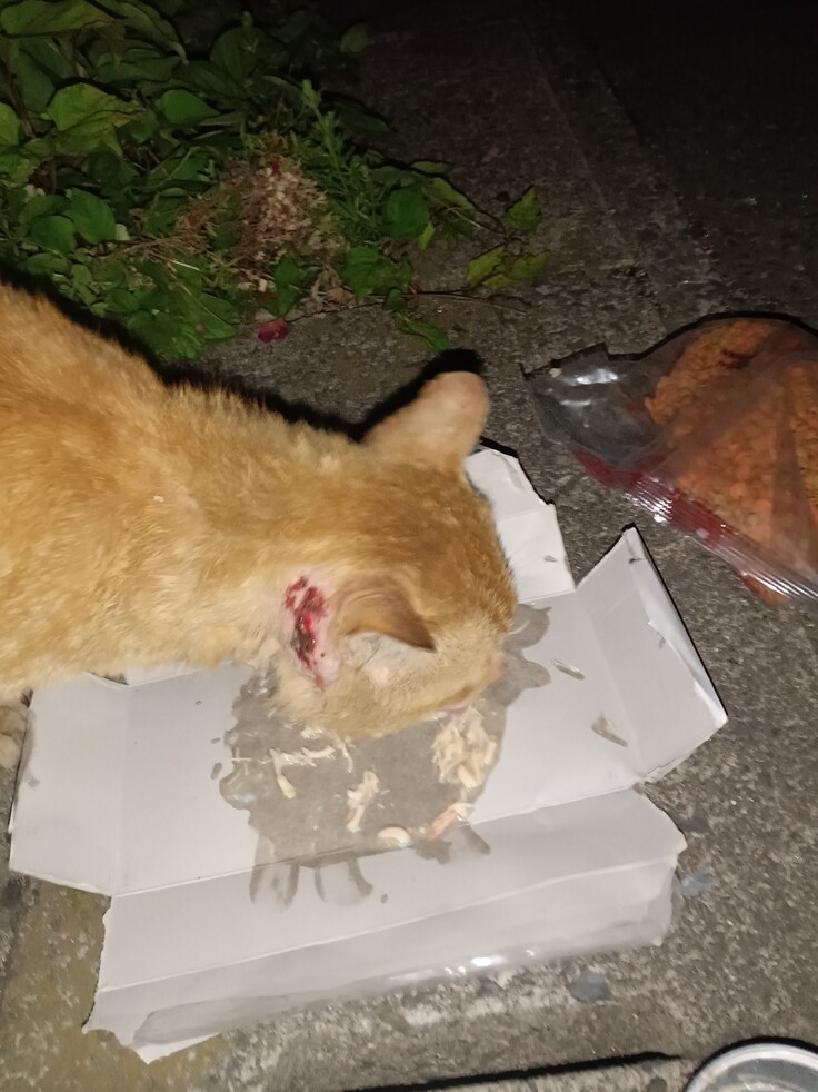 怪我が無いようです、良かったです。餌を上げると別の猫達に食べられてしまいます、ジュニア君はおっとりとした