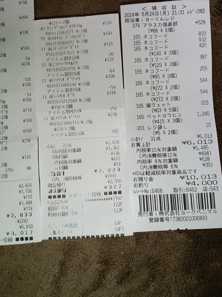 皆様のご支援金で、色々と餌を買う事が出来ましたので、大変感謝していまふ🙏 5月の餌代を付けで買っていた猫フードの分のレシートも用意していたのですが、具合いが悪くて、頭も毎日もうろうとしていまして、無くしてしまった様です💦 5月と7月までの餌代の予定でしたので、支援金で支払いました🙏本当にありがとうございます🙇