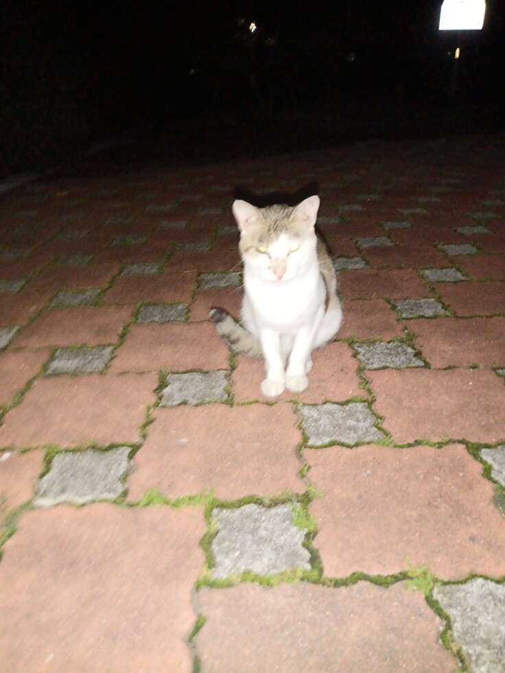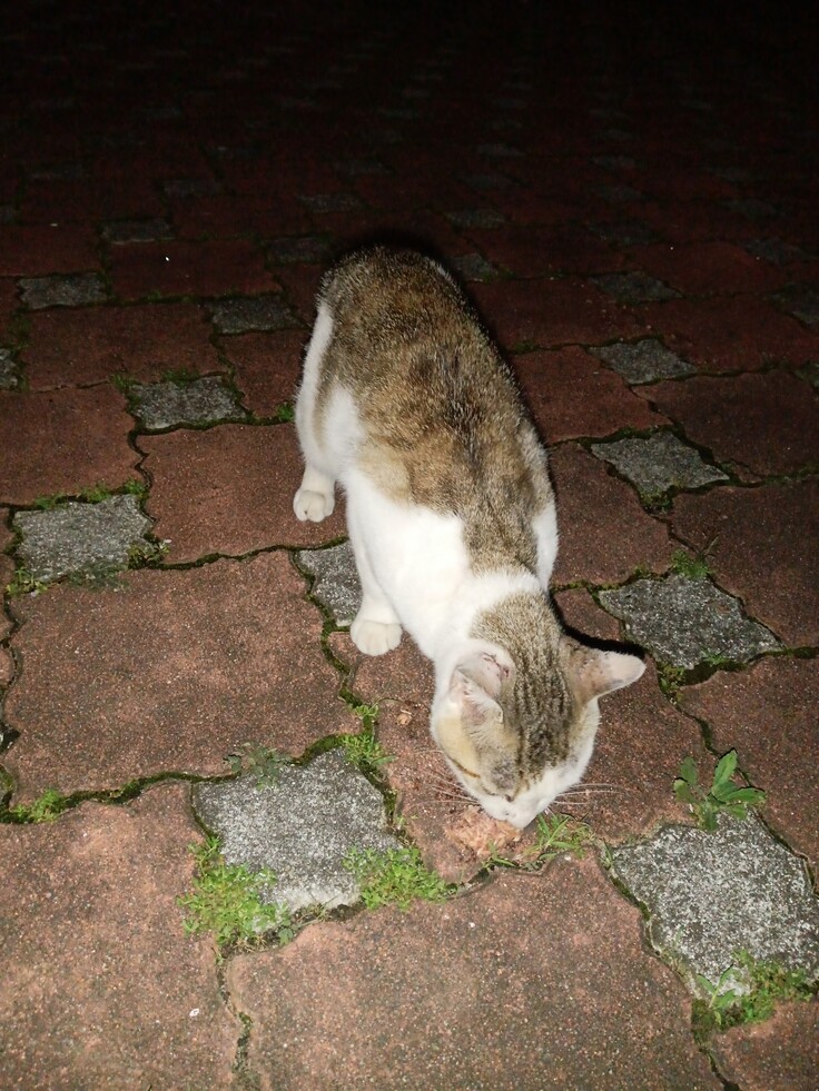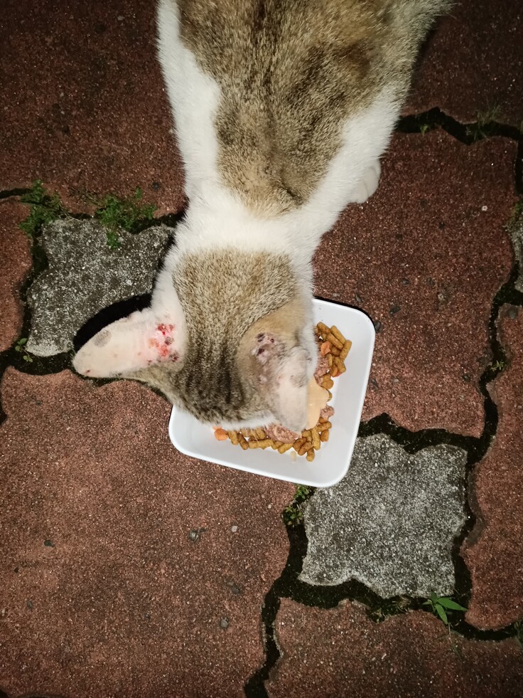 顔に傷があるので、オス猫かと思いました、喧嘩の跡かなぁ〜と…お腹が空いたのか、呼び止めたら、止まってくれました🙂 なかなか近寄ってきませんので、缶詰めてで誘き寄せて見ましたら、食べてくれましたが、なんと、疥癬にかかっていました💦