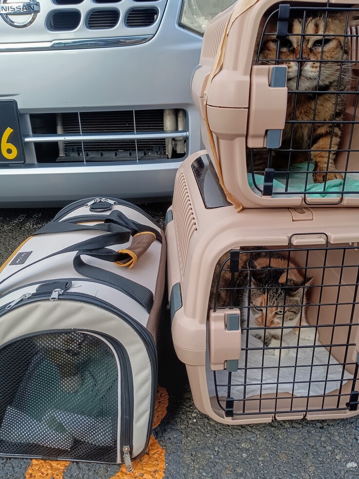 背骨がくっついたミミちゃんと全身が痒くて、全部良くならないにゃんた君とおしっこの中に血が混じって居るココロ君を連れてきました。