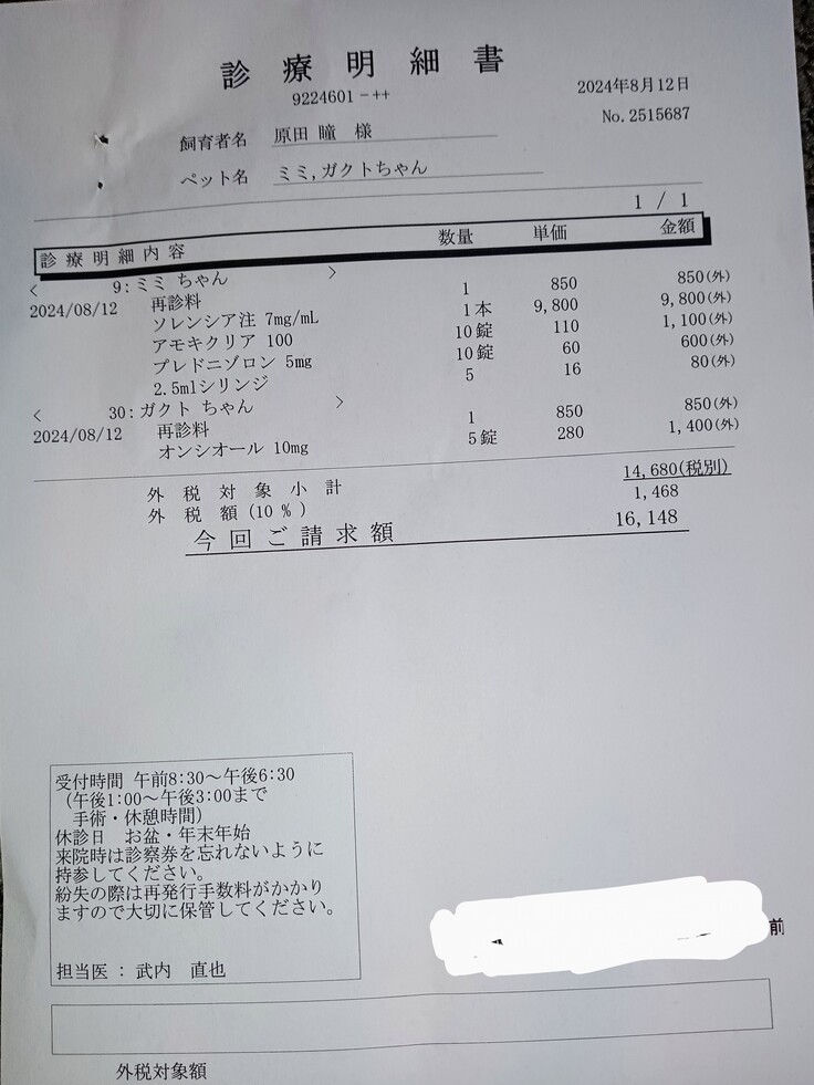 前回別の病院で2匹分で2万5千円、一本7千700円位でしたが、こちらの病院ですと一本1万1千円だそうです😰