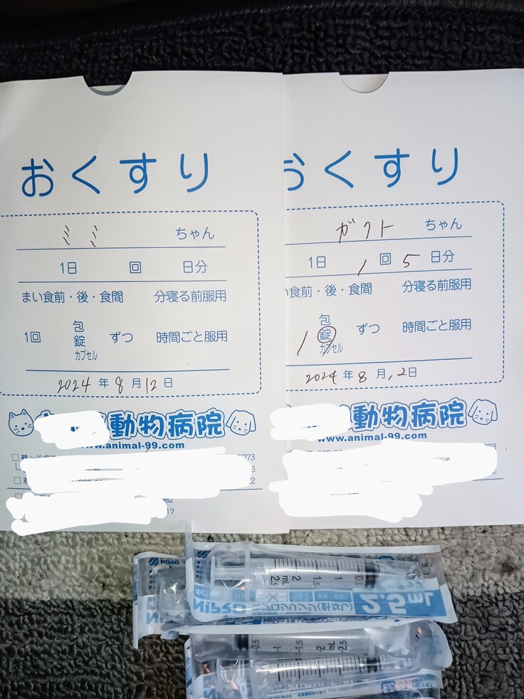 なので、ミミちゃんの分だけをしてもらいました。ガクト君は痛みのお薬を貰ってきました。後は野良猫用の抗生物質とステロイド剤を貰ってきました😊