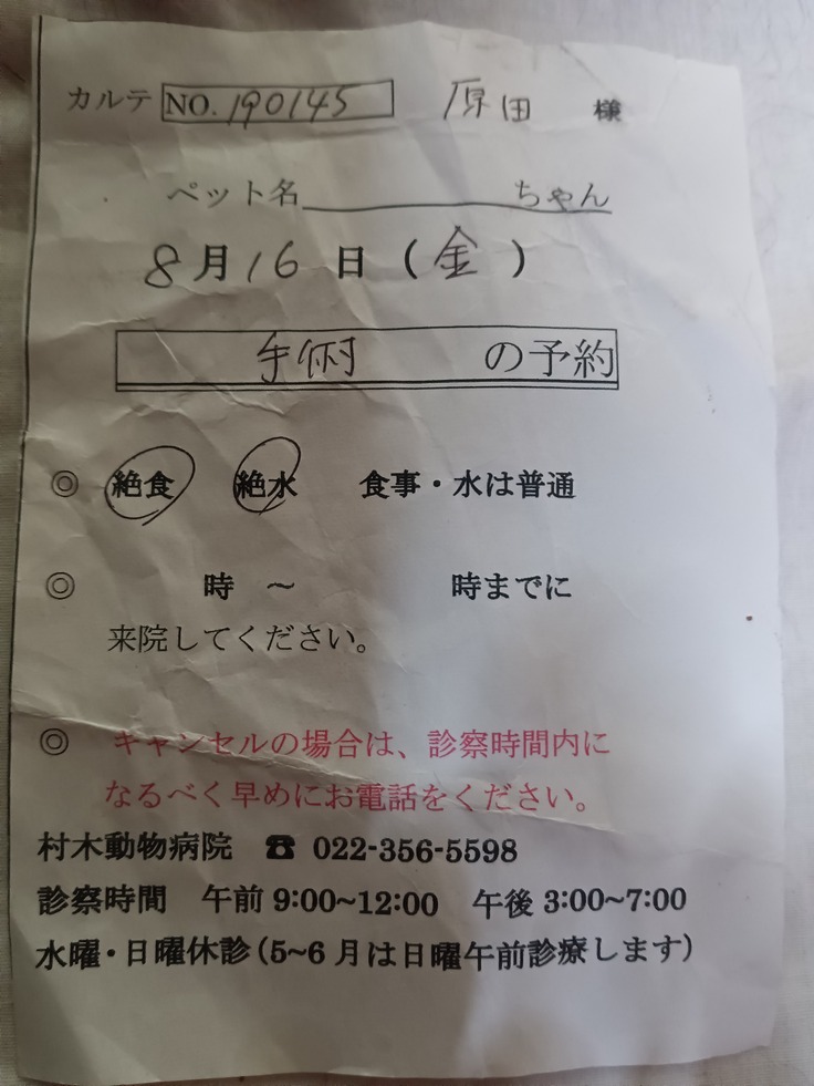 8月の16日に去勢の予約をしていましたが、肝心の疥癬の猫が全く姿を見せてくれません💦 やつは何処へ蜘蛛隠れしたのだろうか😥 探して、去勢が出来る様にしたいと思います🙇