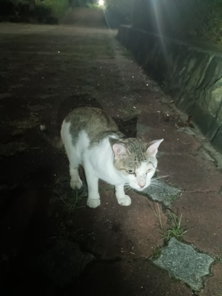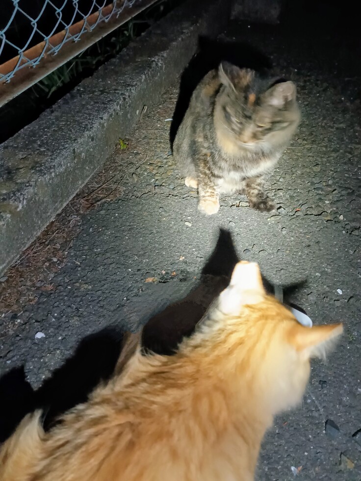 毎晩の餌やりの時間帯でも気温が27、26度あるんのですが、10箇所の餌場を回りながら2時間半から3時間ぐらいかかってしまっています💦 おばさんの私も頭から滝の様に汗が流れて来ては、雨にでも降られてたかの様に頭と顔を拭きながら、はぁはぁぜいぜいしながら、猫同士のケンカを仲裁しては夜な夜な大声でしゃべています🥴