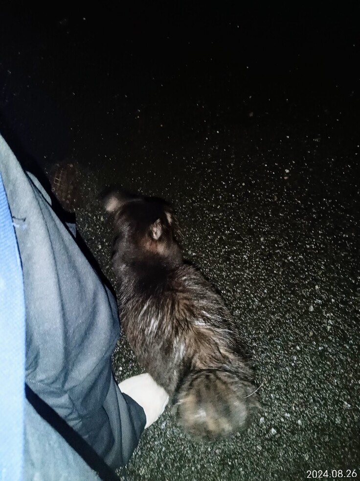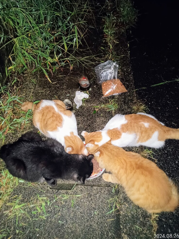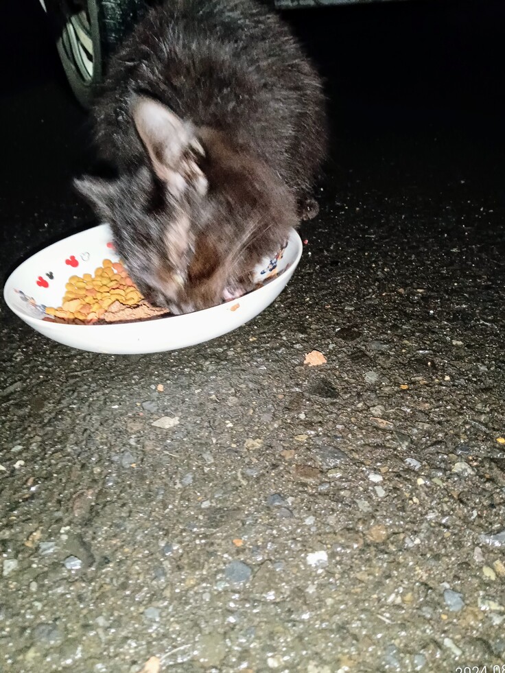 今日は台風で、夜はずっと雨でした💦 お陰様で配達員が少ないので、仕事もと切れませんでした🙂夜中の1時まで配達してから餌やりに来ましたが、斗真のそっくりさんはごびしょ濡れでタマ君とご飯を待っていました。 なんと、カリカリと缶詰めをあげたらむしゃむしゃと声を出しながら勢い良くご飯を食べてくれました😭 昨日の薬が効いたようです🙏目ヤニも少しだけでした、目の充血もピンク色に変わっていました😀 お口の炎症が抑えられたのか、ご飯も喉を通ったんですね😊 本物の斗真よりもなつこくて困りました、全然足元から離れません💦歩く時も足元にくっついて来るので、何度も私が転びそうになってしまったり、この子を踏んづけたりしていました💦 電話のカメラモードも何故か今日は写真がキレイに取れました🙄 フラッシュが効いているので、黒猫の体が写りにくいです💦