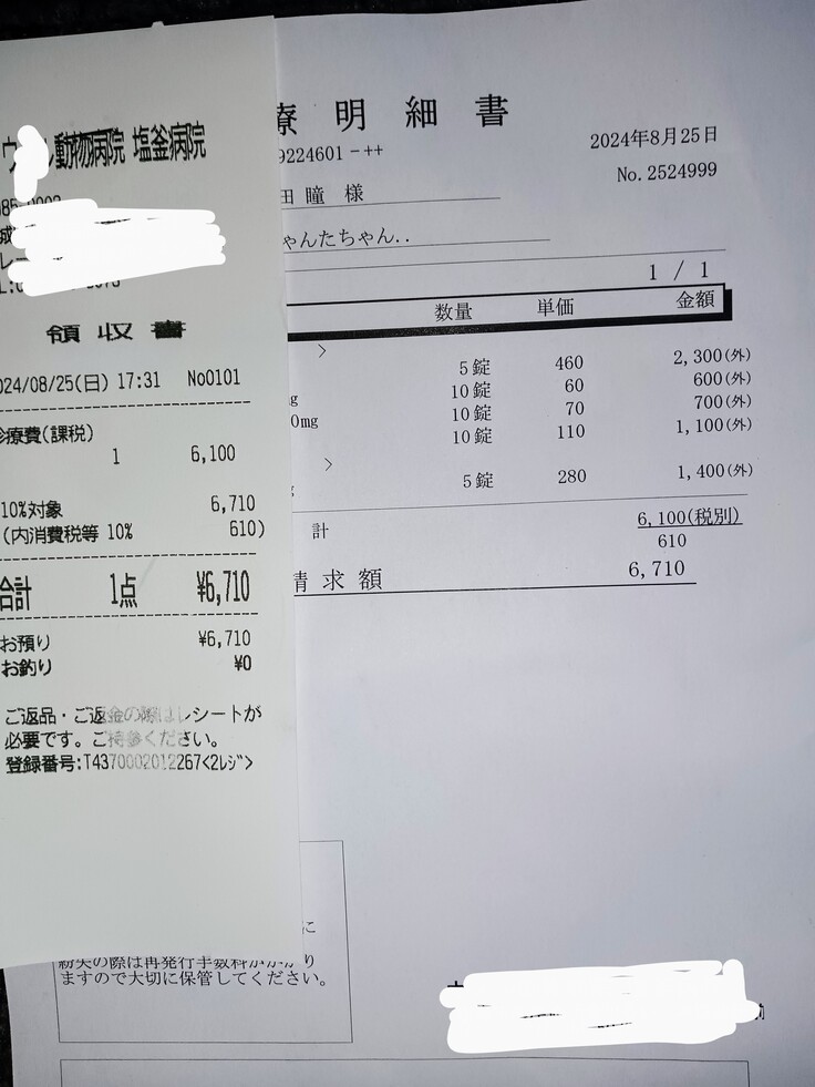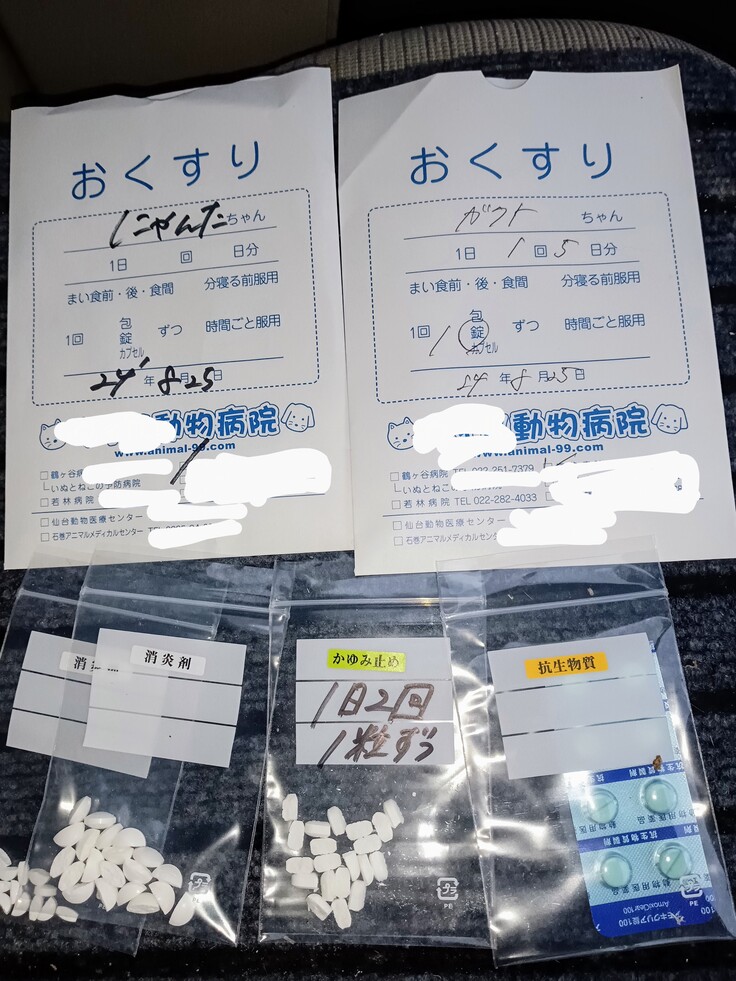 抗生物質とか保護猫のにやんたの全身のかゆみ止めを病院から頂きました。 にやんたのかゆみ止め一錠で460円もするなんて💦 お金が無い時に薬代の高さに全身から冷汗が出ました🥶 6,700円もするんですね〜😵