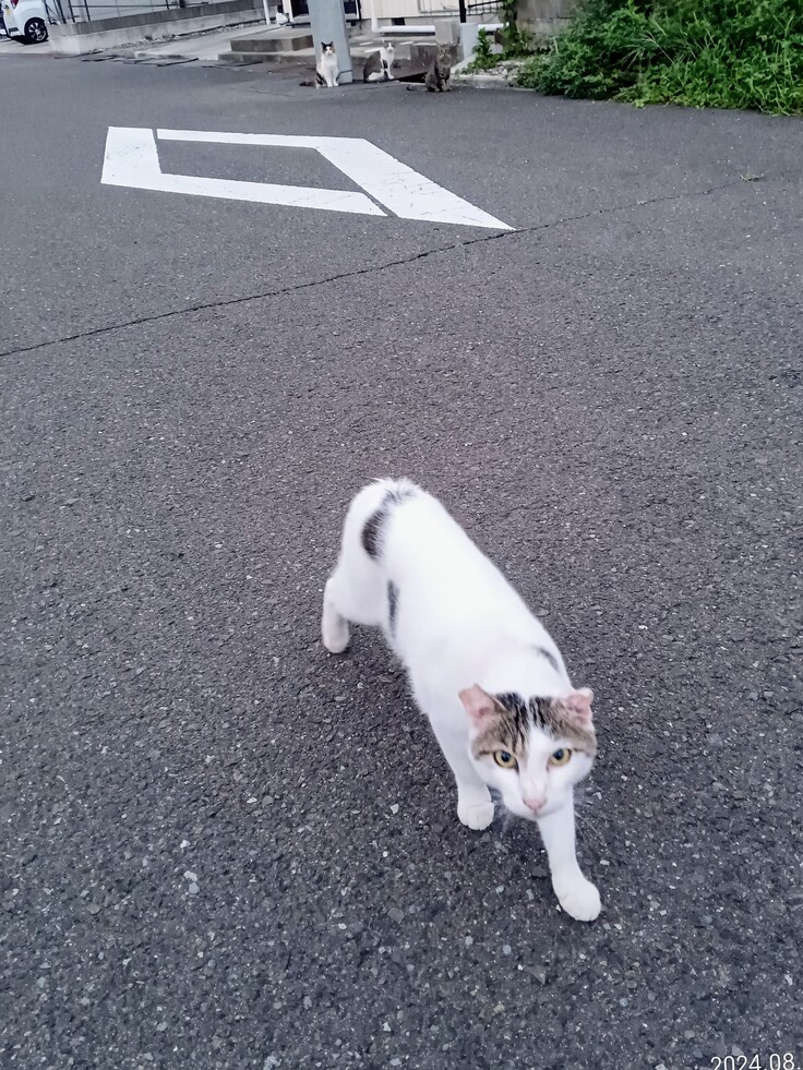 探していたら、別の群れの猫ちゃん達を初めて見ました😵 夜中は一匹二匹位しか見かけないのですが、朝の餌の時間なので、集まっていました。近付いたら、なつこいオス猫が近付いてきました😄