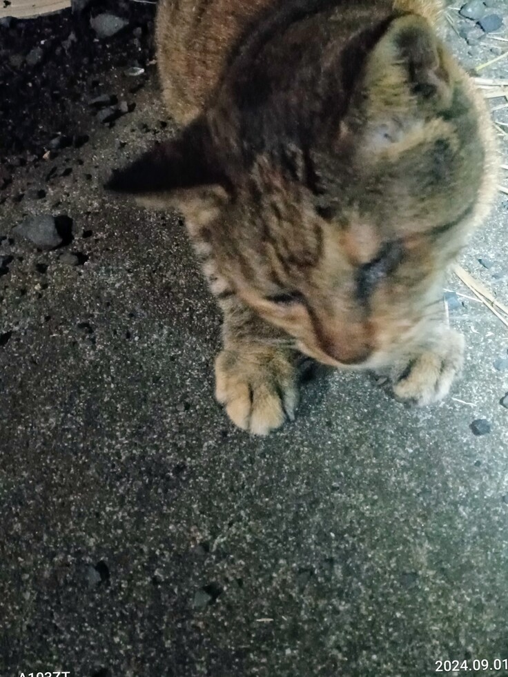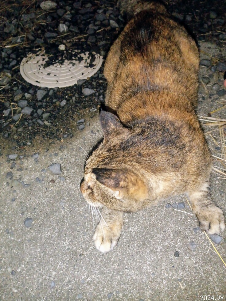 昨日の夜中の餌やりに行きましたら、片目のチャッピーちゃんがいつもの様に駆け寄って来ましたが、何だか頭がいつもより傾いていました😨 傾いたままで、私を見上げているのです、様子がおかしいと思っていましたら、突然地面に倒れ込んでけいれんし始めました😭 慌てて体をさすってあげましたら、もうろとしながら、起き上がれませんでした💦 脳の障害があるので、いつ発作が起きるか分かりませんので、私も心臓が縮まりそうでした🥶