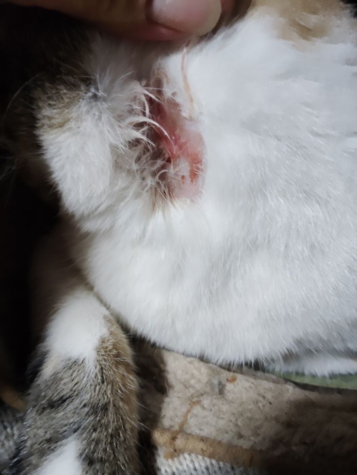 ミミちゃんの耳の中から黒い塊が沢山出て来ました😱 あまりの痒さで首をこんなにもかいてしまいました💦 野良猫達もカイカイしてばかりいましたので、先月付けた薬の効果が切れたのかも知れません。夏場には、ノミ、ダニ、シラミも活発に動いている様です😨