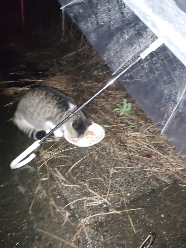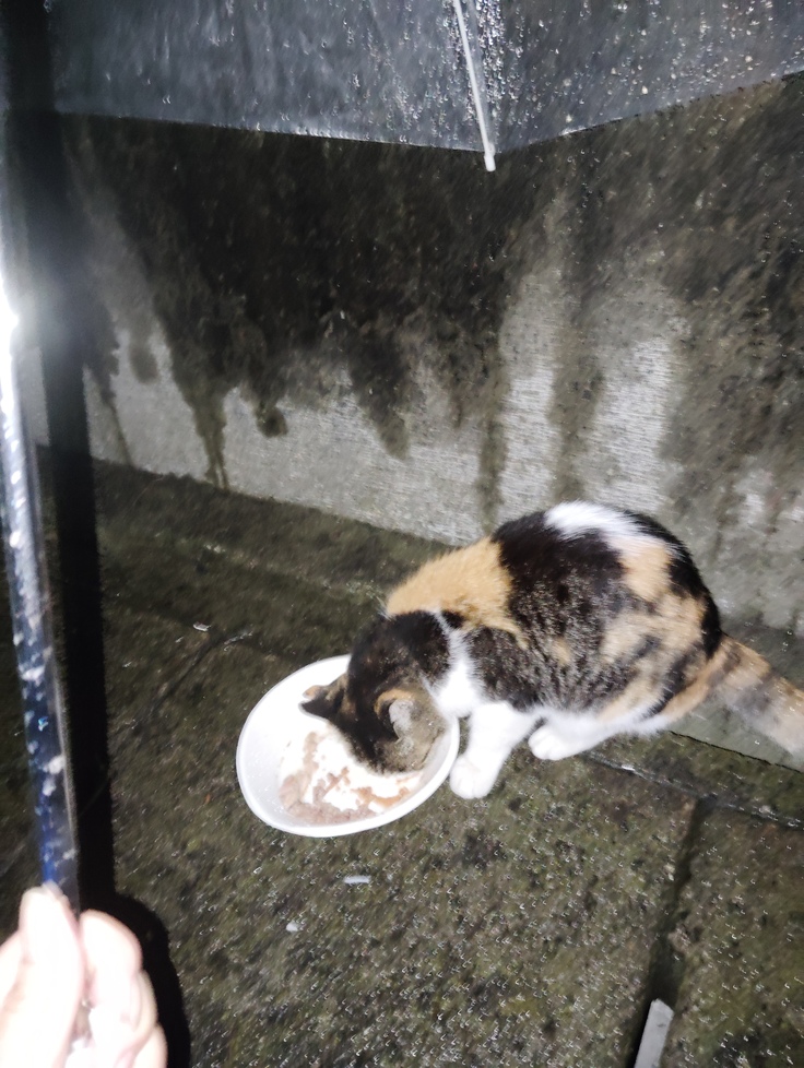 連日の大雨でも、いつも道路で待って居る子達は本当に可哀想です💦 全身ビショ濡れで待っていました🥹 14歳になる小ミケちゃんは公園で暮らして居たのですが、姉妹猫達が小ミケ姉ちゃんと仲が悪いので、最近は道路で待つ様になりました。 雨の日はとても気の毒です💦