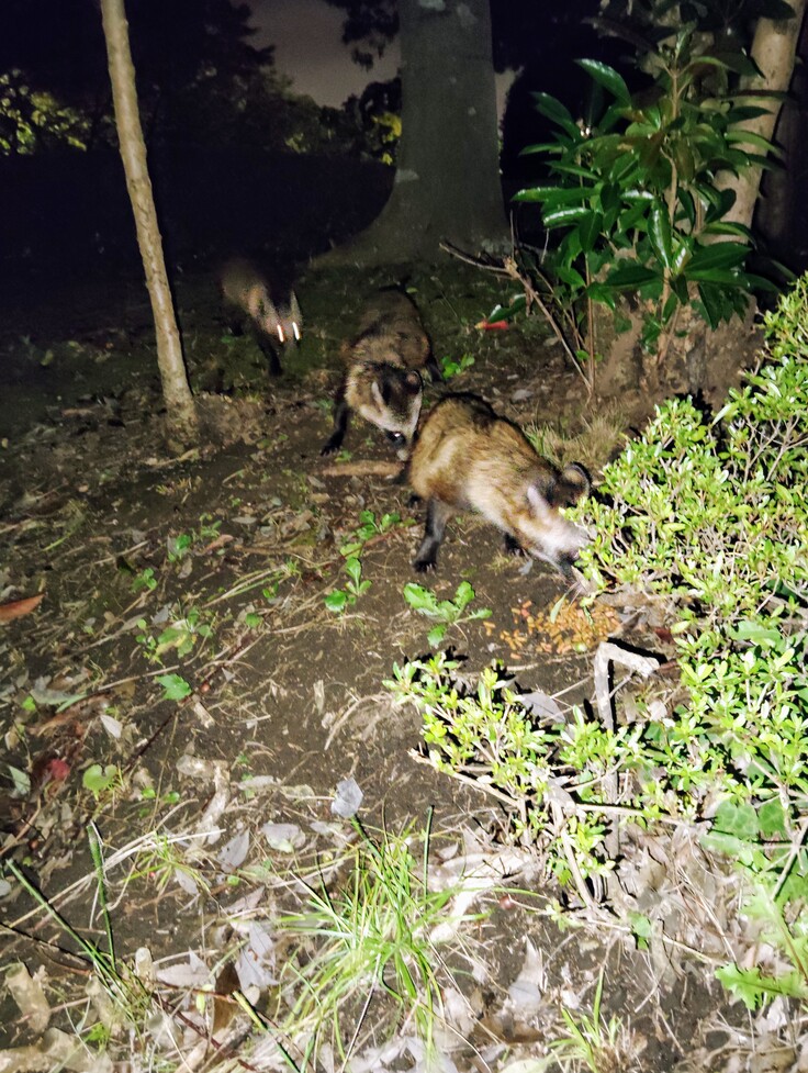少しの餌をあげないと猫達のお皿を加えて奪い取って行きますので、何処に行っても追い掛けて来ては、猫達も全然落ち着かないでいます😓 毎晩本当に疲れて私もめまいが酷くなって来ては、ふらふらなんです💦 猫達の餌やりだけでも2、3時間掛かるのに、たぬきを見張らなきゃいけないので、もう寝ぷかけて半分目がショボショボです😵