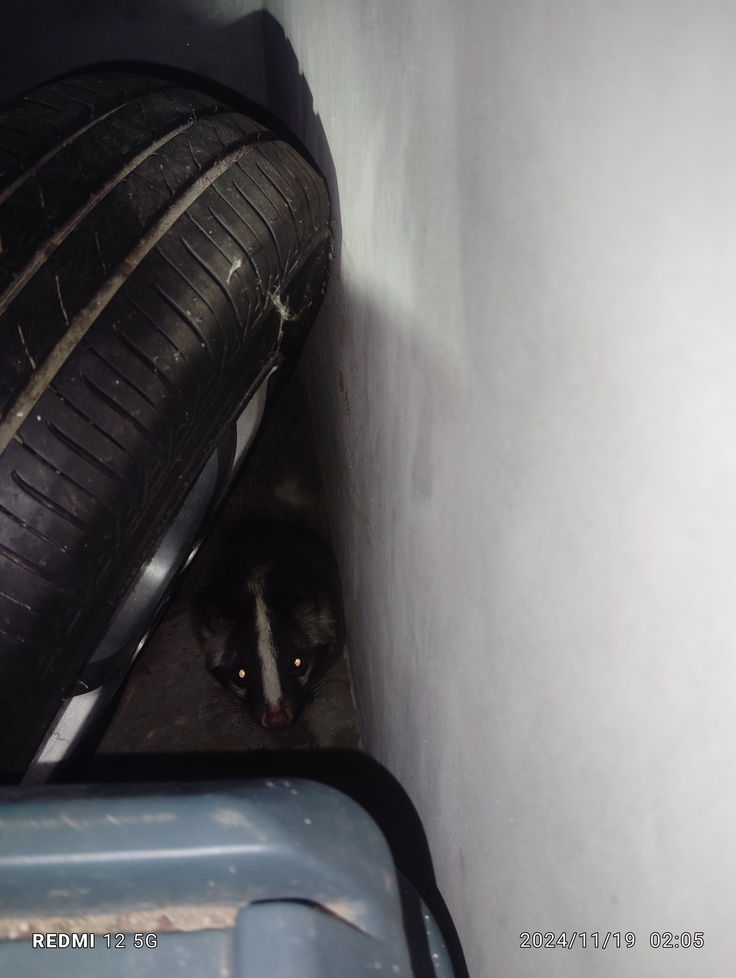 タイヤの後ろに黒い影とがさごその音がしたと覗いたらハクビシンが隠れていました😨