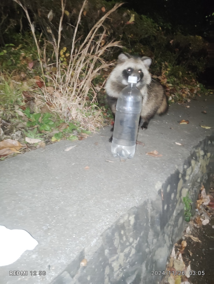 私が目を離した隙に猫達の餌を入れ物ごとにくわえて逃げるタヌキ共💦 公園のほとんどの木がどんぐりの木なのですが、地面一杯にどんぐりが落ちて来ているのに、猫達の餌の美味しさを分かってしまっているので、犬ずわりで皆私を見ています😵