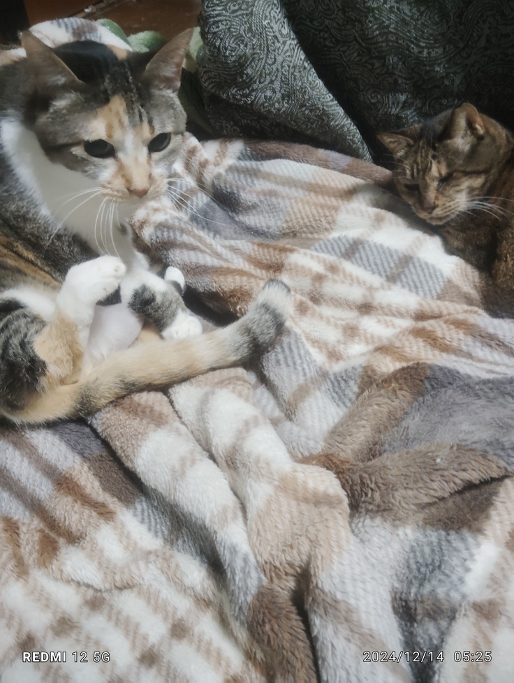 最近凄く元気が良くて、私が仕事と野良猫達の餌やりで長時間家を開けて居るので、朝方に帰って来るとチャッピーは嬉しくて、家中を走り回るのです😅 朝方周りの人達はまだ寝ているので、チャッピー静かに〜🤫と笑いながら止めるのですが。 その可愛さが私の心のより所にもなっているのです😊 そしてミケ猫のミミは皆様のご支援を預かりまして、抜歯の手術が出来まして、長年苦しんで来た歯の痛みから開放されたと思っていましたら、高齢により、背骨がくっついてしまいました。背中を丸めてしんどそうに歩くのです、毎月骨の痛み止めの注射をしなければいけないのですが、ガクトと言う子も四本の足の骨が変形をして来てまして、9キロ近くある体重をびこ引きながら歩くのです💦 2匹分の注射代で2万5千円近く掛かります💦自分のリューマチの治療費も毎月2万5千円なのです。 前の薬が効かなくなってしまいましたので、注射に切り替わりました。 薬が切れると徐々にあっちこっちが痛み始めて来るのですが、終いには肩か完全に上がらなくなり、足が腫れ上がって歩く事もできなくなります、。指もパンパンに腫れ上がって物も掴めなければ、指を伸ばすだけでも激しい痛みで、本当にカカシの様になってしまいます🥵