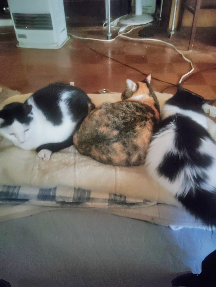 最近めっきり寒くなりましたので、13年前の東北の津波震災で私が住んでいる築50年の借家も窓が隙間だらけになってしまいまして、家が傾いていると市役所の検査で言われました💦 半壊していないので、なんの手当も有りませんでした😞 なので、冬になると隙間風が何処となく吹き込んで来るのです💦 家に居る猫達も外で暮らしている様な感じてすが、 冬になると仕事に行く時にはこたつを付けっぱなしで出かけるのです。ストーブも付けて3時間タイマーで暖かくして行くのですが、地震が来たらストーブは止まるだろうとこたつの電気は震度が強ければ電気も止まるだろう、と悩みながら、猫達が寒い家の中て居るのが可哀想なので、結局は毎年電気代もばかにならないのです💦 ところが、毎日のようにこたつ布団にオシッコをするバカ猫達が居るのです😭 こたつのコンセントにもオシッコがかけられて臭くてこたつを付けると部屋中が臭くなってたまらないのです💦