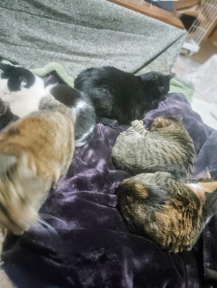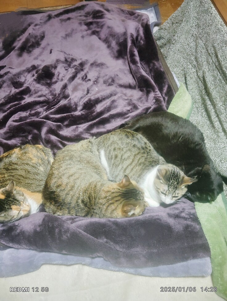 家の保護猫達は私の布団の上を占領しています😵 目が覚めると自分は布団の外に追いやられている状態になりますが、皆も暖房が切れている部屋では寒さをしのえる場所を知っているもんです😁