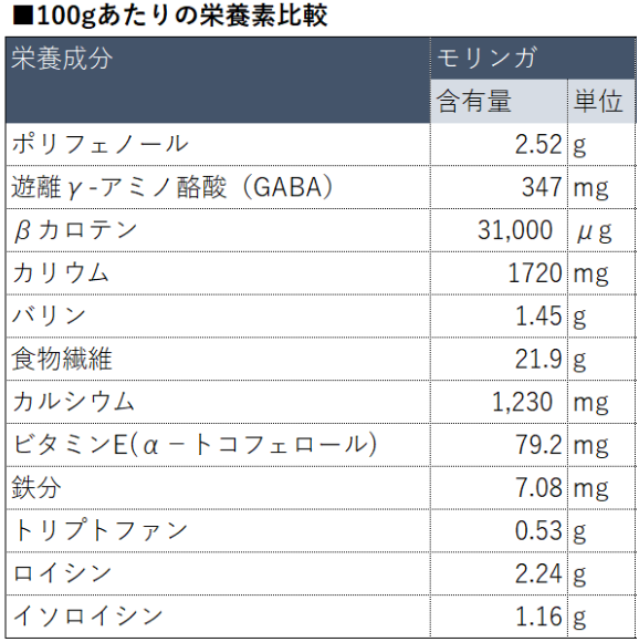 モリンガは「奇跡の木」、「生命の木」などと言われ、これまでに発見された可食植物の中で最も栄養価が高いとされ、その葉にはビタミンCはレモンの約6倍、鉄分はプルーンの約6倍、カルシウムは牛乳の約6倍など基本栄養素をかなり含んでおり、国際連合食糧農業機構(FAO)より子供などの栄養状態改善に利用を推奨されています。