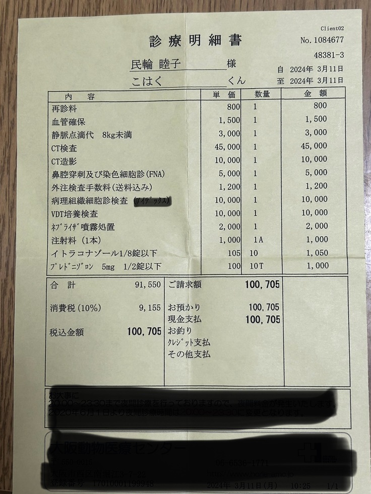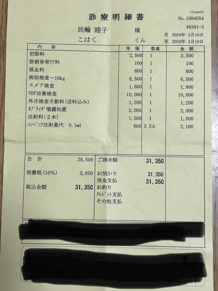 この日は細菌検査・培養検査のために鼻の粘液を取り、ネブライザー・注射などの治療をしてもらいました。
