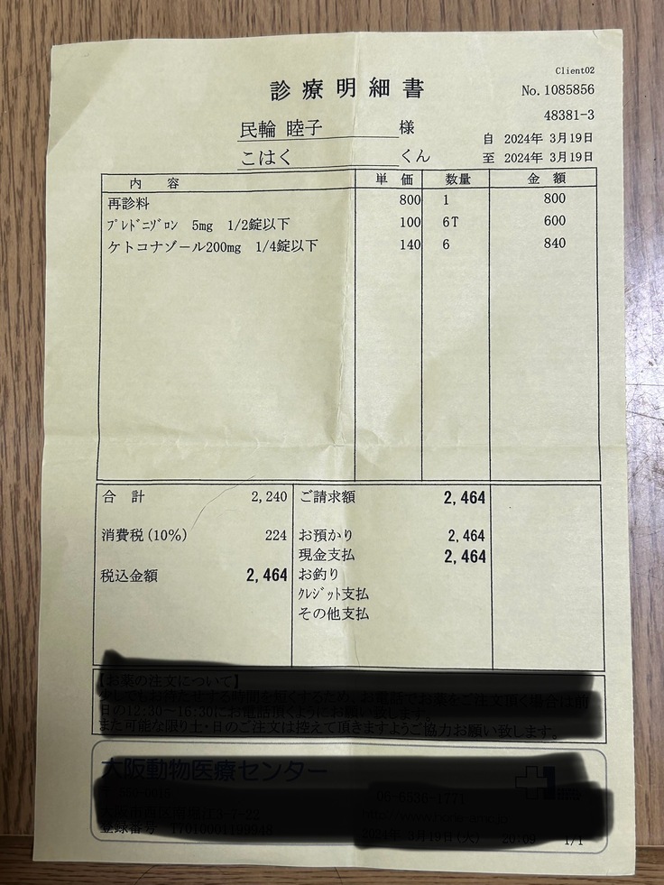 抗真菌薬とステロイドを処方してもらい、この日は終了です。