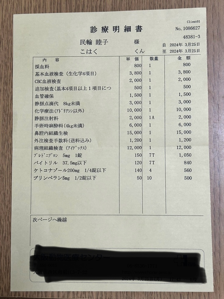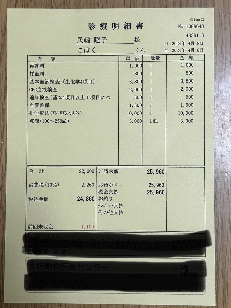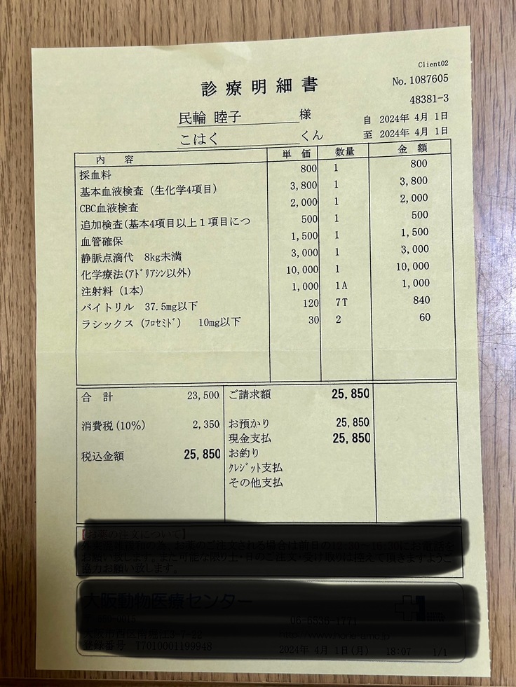 琥珀の抗がん剤治療、その都度行われる血液検査代として、全て使用させていただきます。