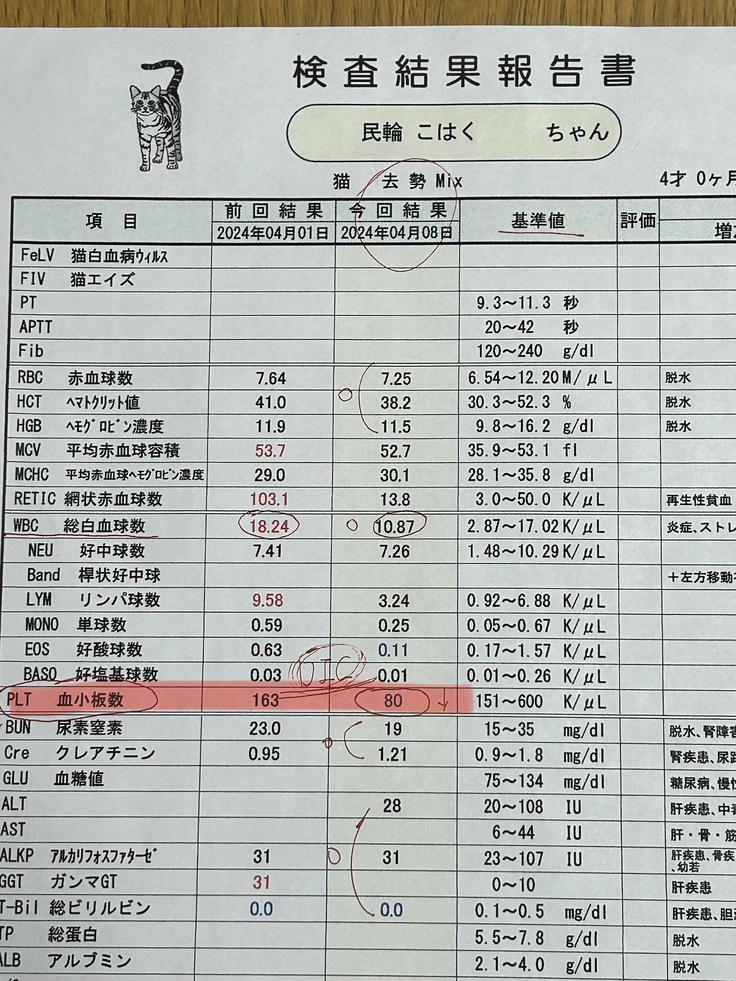今回は血小板の数値が低かったせいか、ずっとだるそうで、8日には1度吐きました。