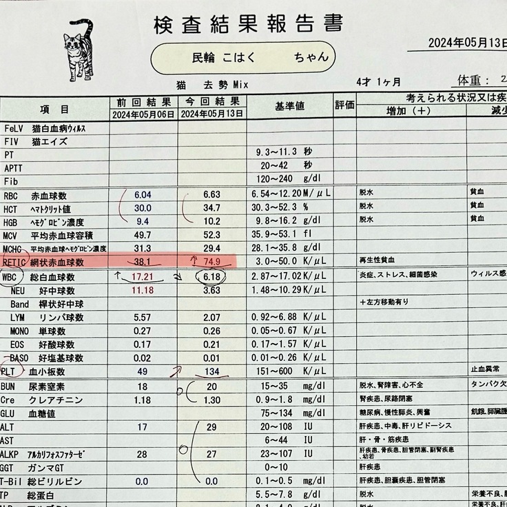 血を作る細胞の数(RETIC)が平均以上となり、頑張って血を作ってくれたとのことでした😄