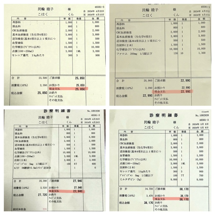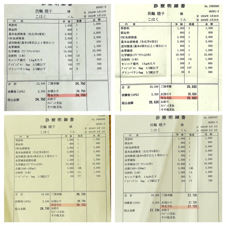 抗がん剤と一緒に栄養剤の点滴や、抗がん剤の副作用を抑える注射、内服薬の処方、レスキューの抗がん剤が2回あったりと、すでに振り込まれる金額を越えようとしています。
