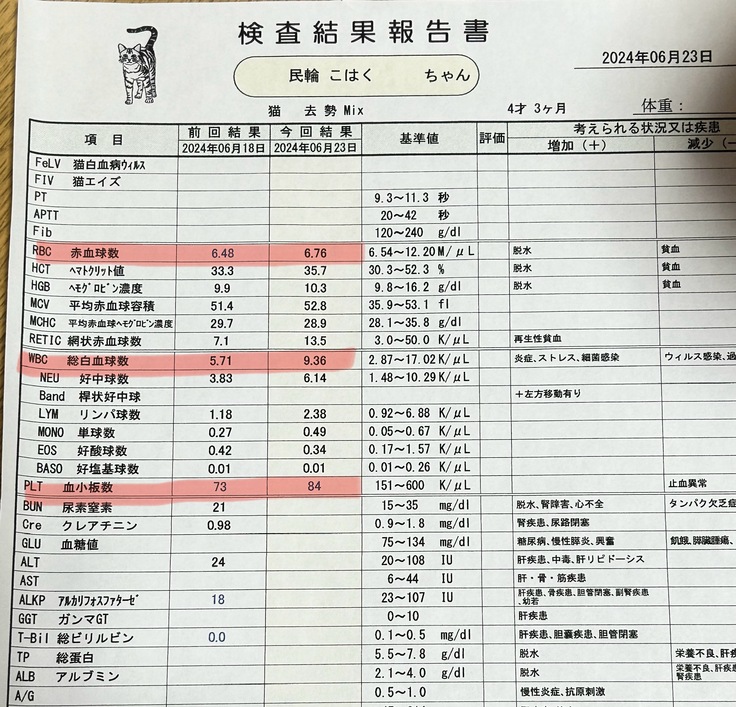先生が1番心配されていたのは、凝固異常で血が止まらなくなる事で、血液検査の結果を見る限り血小板の数値は低いものの、凝固異常はなく抗がん剤の副作用ではないとのことでした。