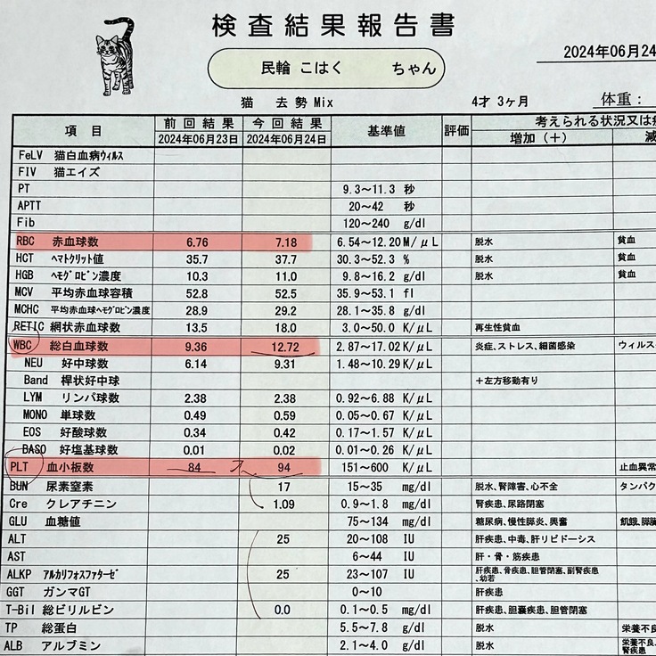 琥珀は内臓が強くて、内臓の数値は1度も悪化した事がありません。先生も「若いっていうのもあるけど、かなり強いですね」とビックリされていました。