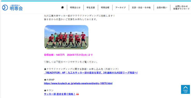 九工大サッカー部の存続を目指して実施している本活動を、九工大のホームページ、そして、明専会のホームページでも紹介していただいています!
