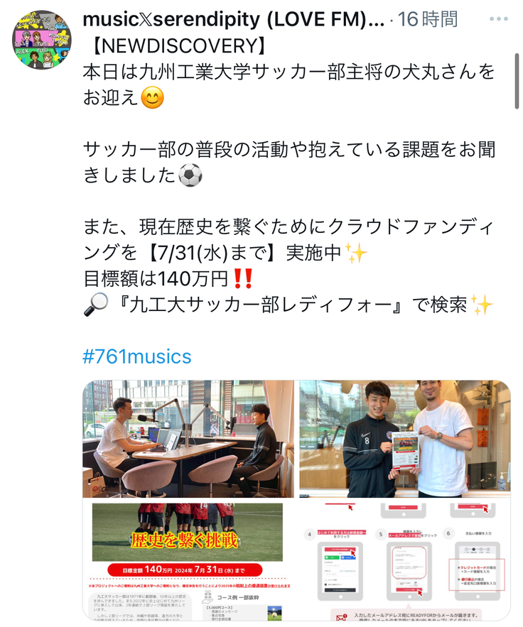先日、出演させていただきましたラジオ番組、「music ×serendipity 」さんの公式X(旧Twitter)にて、クラウドファンディングのチラシを掲載していただいています!