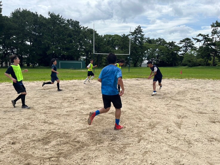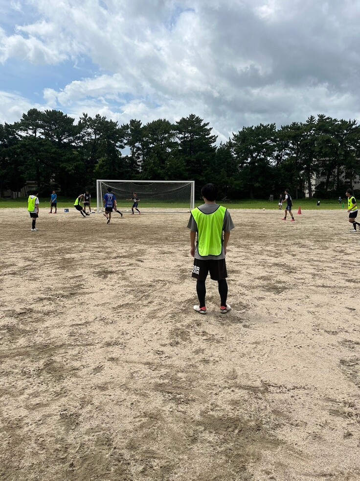 土のグラウンドであり、ほとんどの練習では他団体とグラウンドを共有する関係で、半面であるため、試合のような芝生の広い環境では練習ができませんが、その分、オフ・ザ・ボールの動きの練習に力を入れています!