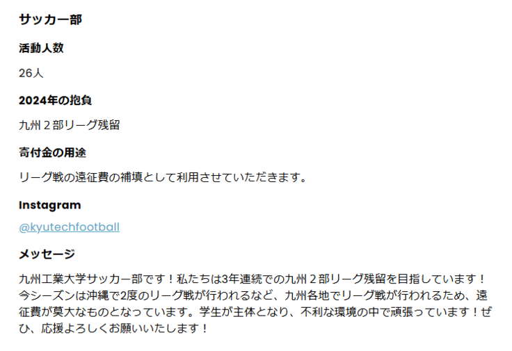 九工大サッカー部の活動をより良くするため、少しでも多くの資金を調達する必要があります。