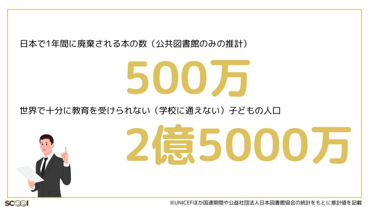 そうした廃棄本(≒除籍本やリサイクル本)は、住民に無償で配布されたり、リサイクルされたりと有効に活用される一方で、残念ながらゴミとかしてしまうものも一定存在します。モノが溢れた日本においては、そうした事実を知らない人もいるでしょうし、「それがどうした?」と悪気なく感じる方もいるでしょう。その一方で、学びの機会だけでなく、学ぶための最低限の物資に困る人たちがいるのも事実です。