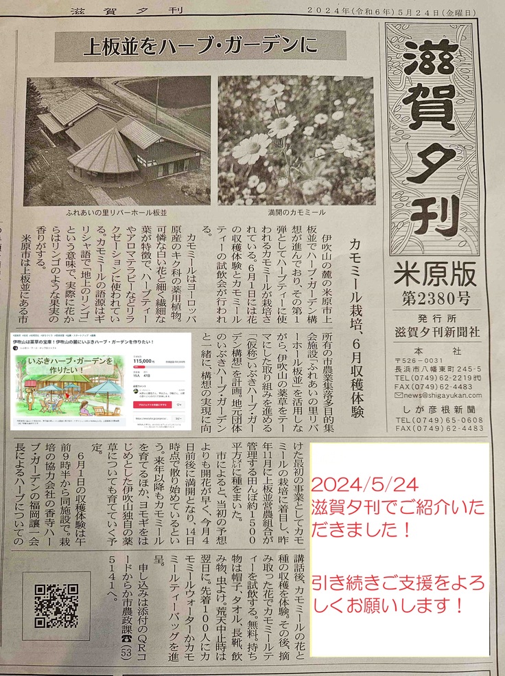 5月12日から始まったプロジェクトですが、6月1日開催のカモミール収穫体験イベントの記事を滋賀夕刊さんでご紹介いただきました!