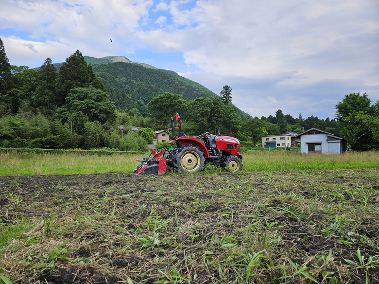 草が長くなってきたので、トラクターで耕します。水路から水が漏れていたようで、奥の方は乾くまでそのままにしようと考えています。