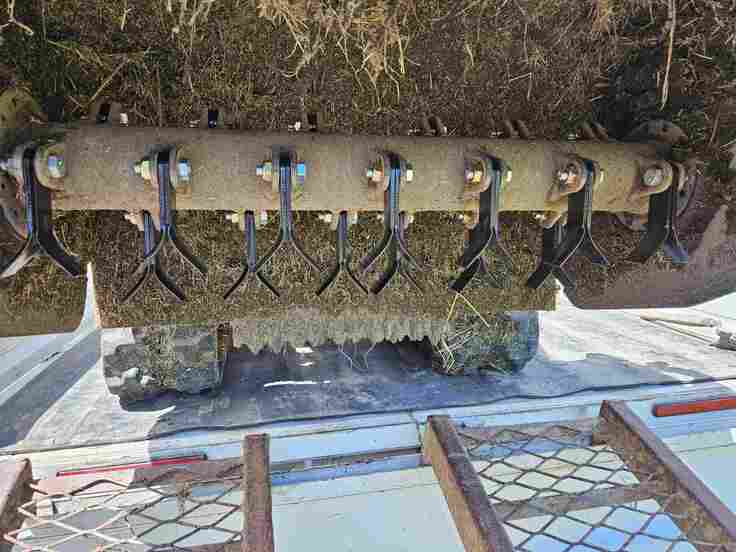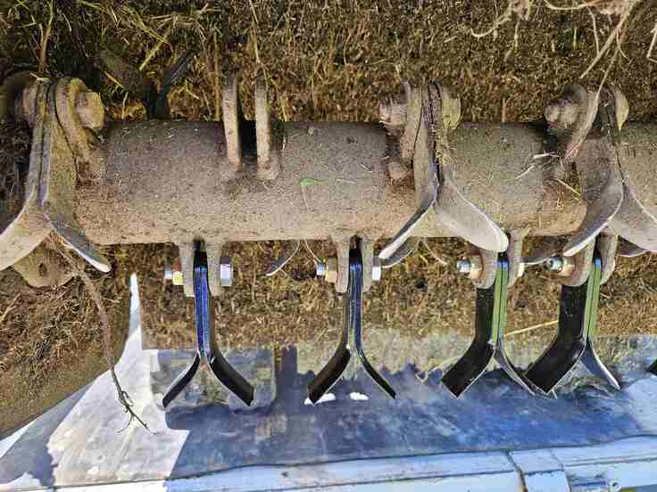 ハンマーナイフモアという機械で草刈りします。集落が所有している機械を借りての作業です。刃が丸くなっていたので交換作業から。