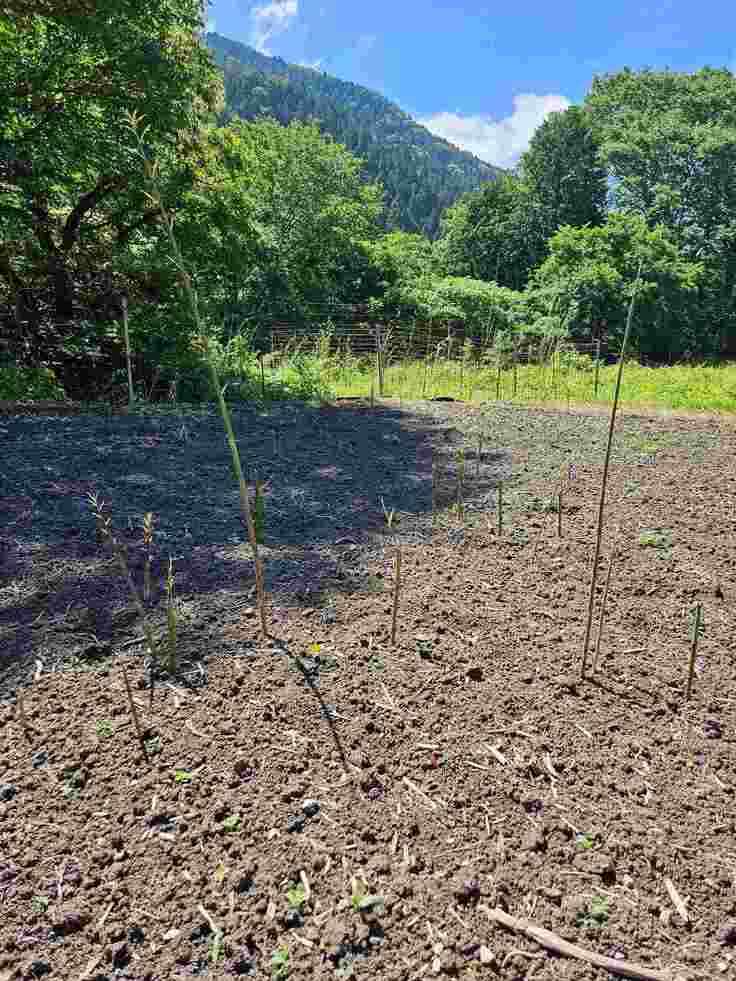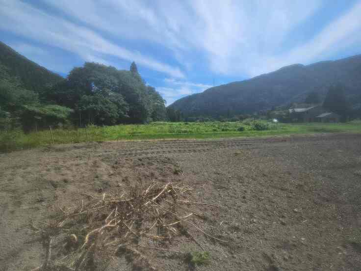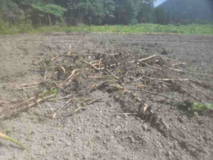 鍬で掘り起こし、根っこが出てきたらトラクターにワイヤーを括り付けて引っ張り出します。今日の成果は写真のとおりですが、地中で切れてしまうのも多々。少し様子を見てから、次はユンボで掘り起こす予定です!