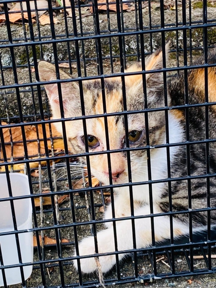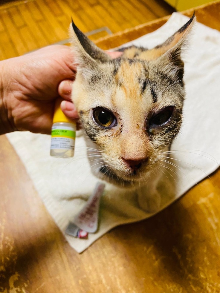 TNR4、 インフルエンザにきっていた仔猫。 引き続き、 豊橋市内の某公園で夫婦がごはんをあげている同場所にて 8月28日、 生後三か月ぐらいの 雌の仔猫を捕獲、保護しました。 インフルエンザにかかり、鼻詰まりと ノミでひどい痒みと発疹を引き起こしていました。