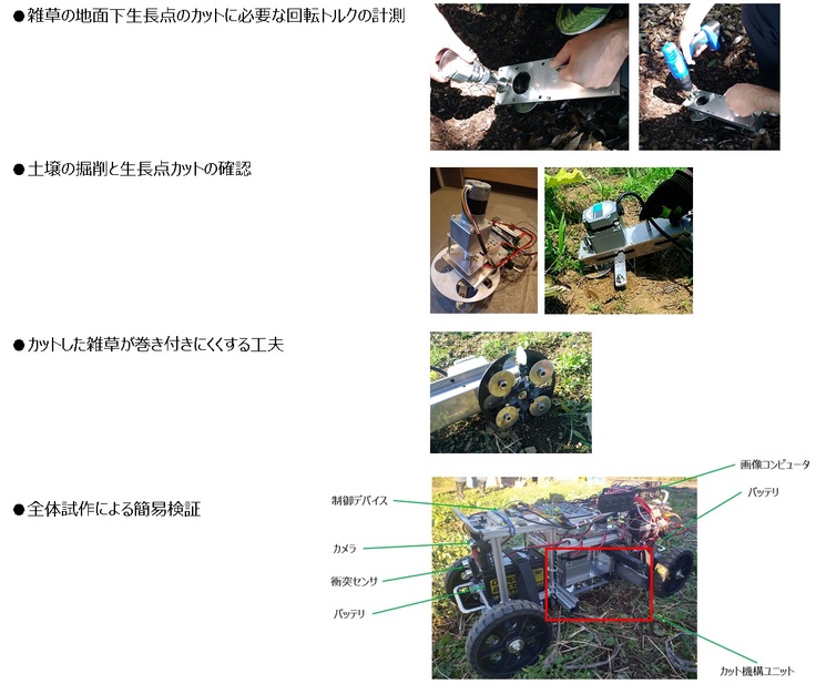 除草ロボットの試作機に搭載する,除草のみを見つける画像認識機能,増殖器官からカットする機能,これらのユニットを移動させる機能,支援する機能に関する試作機を開発します.なお,弊社の労務費は含まれておらず,全て外注費(部品加工,部品購入等)のみに充当します. 組み上がった試作機をもって,支援者様にデモを見て頂いたり,実際に触って頂くことから,力の弱い方でも使いこなせる支援機能(作業方法,ロボットの使い方,弊社からの遠隔支援等)に何が必要なのかを抽出し,次の開発に活かします.