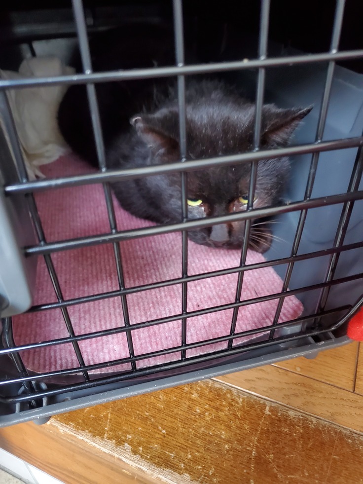 黒猫保護。初めて見る子で 交通量の多い道を渡り 御飯の方へ寄って来ました。よく見ると後ろの脚2本 地面にちゃんと着いてなくて 歩き方がぎこちなくて 急遽 保護しました。大人しい子で そのまま抱いてキャリーに😅