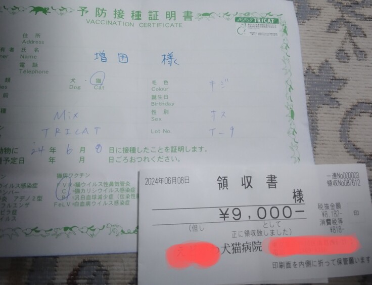 (領収書の増田は、私の旧姓です。)ワクチン、ノミダニ駆除の薬もつけてもらってこの金額です。