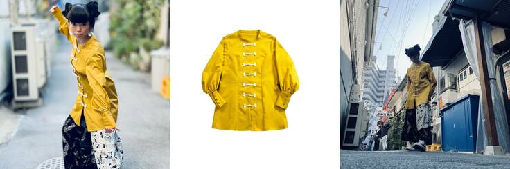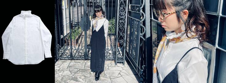 甘くなりすぎないフリルにスタンドカラーの落ち着いた雰囲気が魅力