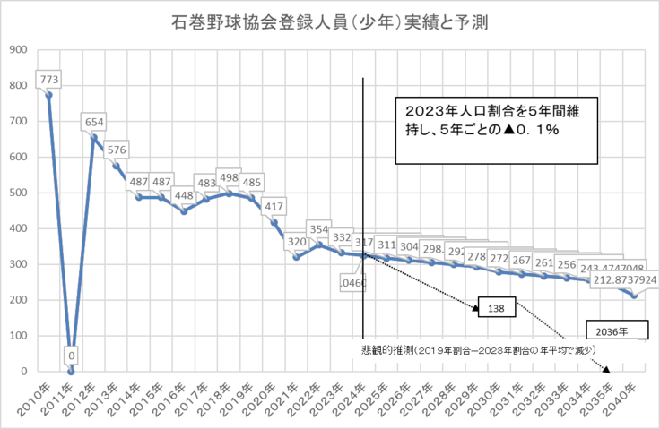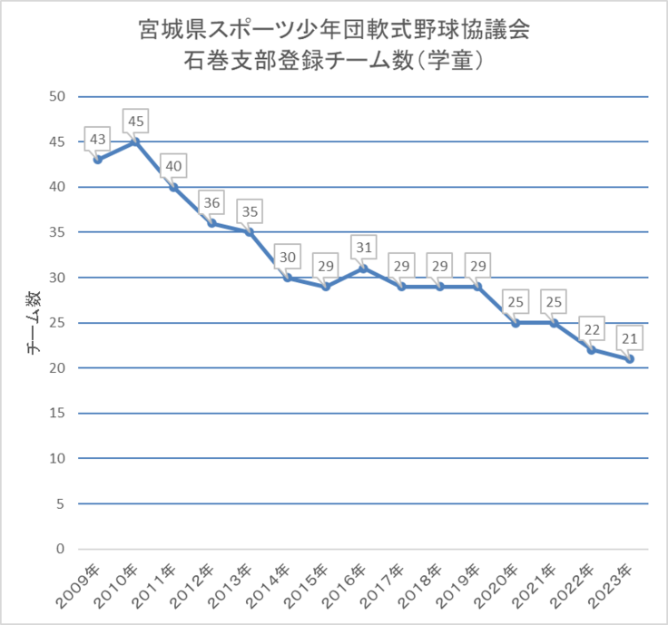 ※石巻野球会議発足の2014年以降は数年間、増加傾向にありました。しかしコロナ以降の減少が著しいです。