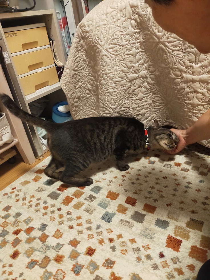 のそっとベッド下から出て来て、ばあちゃんに撫でてもらってゴロゴロ言っていました😻すぐスリスリゴロゴロ😻ほんと愛おしいとらちゃんです😻
